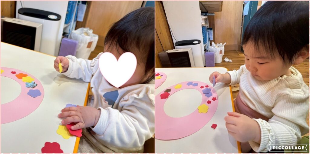 0歳児クラスのお友達も手先を上手に使って製作を楽しんでいます!