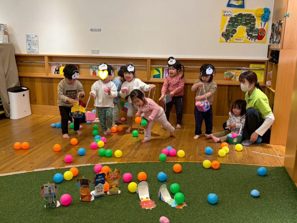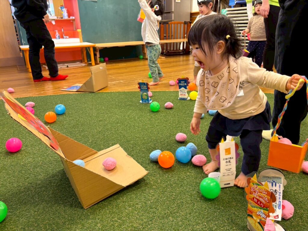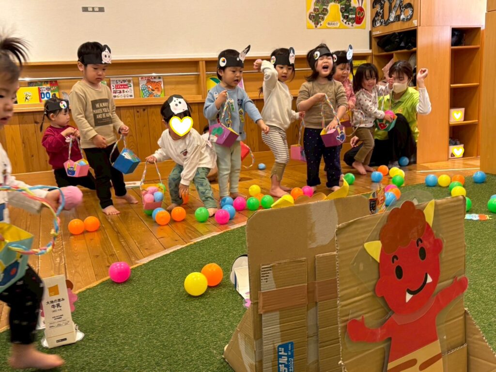 鬼の的あてゲームでは小さな鬼から大きな鬼までボールをエイっと投げて鬼退治しました。